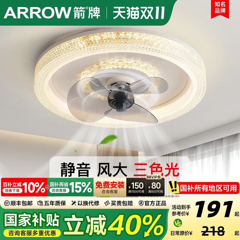 箭牌隐形风扇灯餐厅卧室吊扇灯新款家用客厅中古风电扇灯一体静音