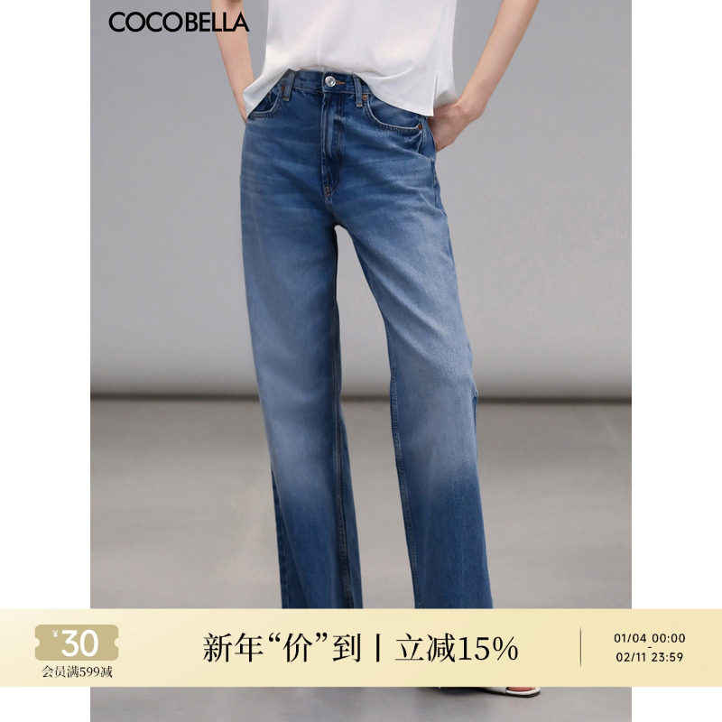 COCOBELLA复古水洗渐变磨白毛边牛仔裤女秋休闲舒适直筒长裤DN82