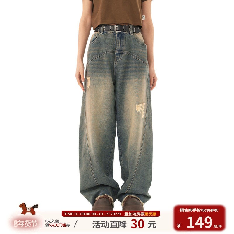 NARTALIY黄泥破洞毛边牛仔裤男纯棉潮牌美式高街阔腿直筒宽松长裤