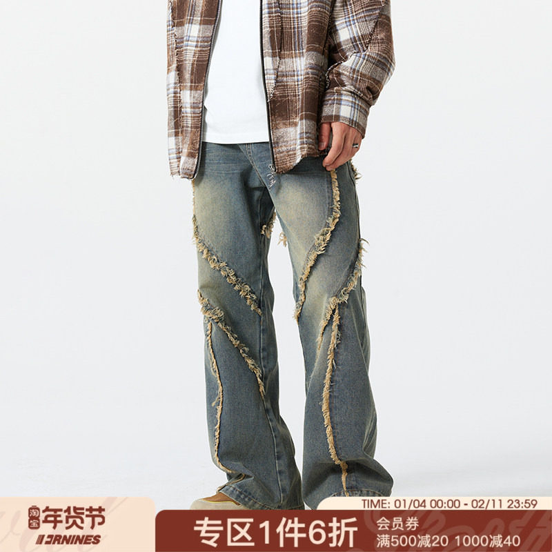 FORNINES微喇擦色毛边牛仔裤男女潮牌春秋设计感复古直筒美式长裤