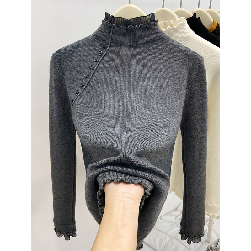 半高领网纱拼接木耳边针织毛衣女冬季新款纽扣设计感加厚打底上衣