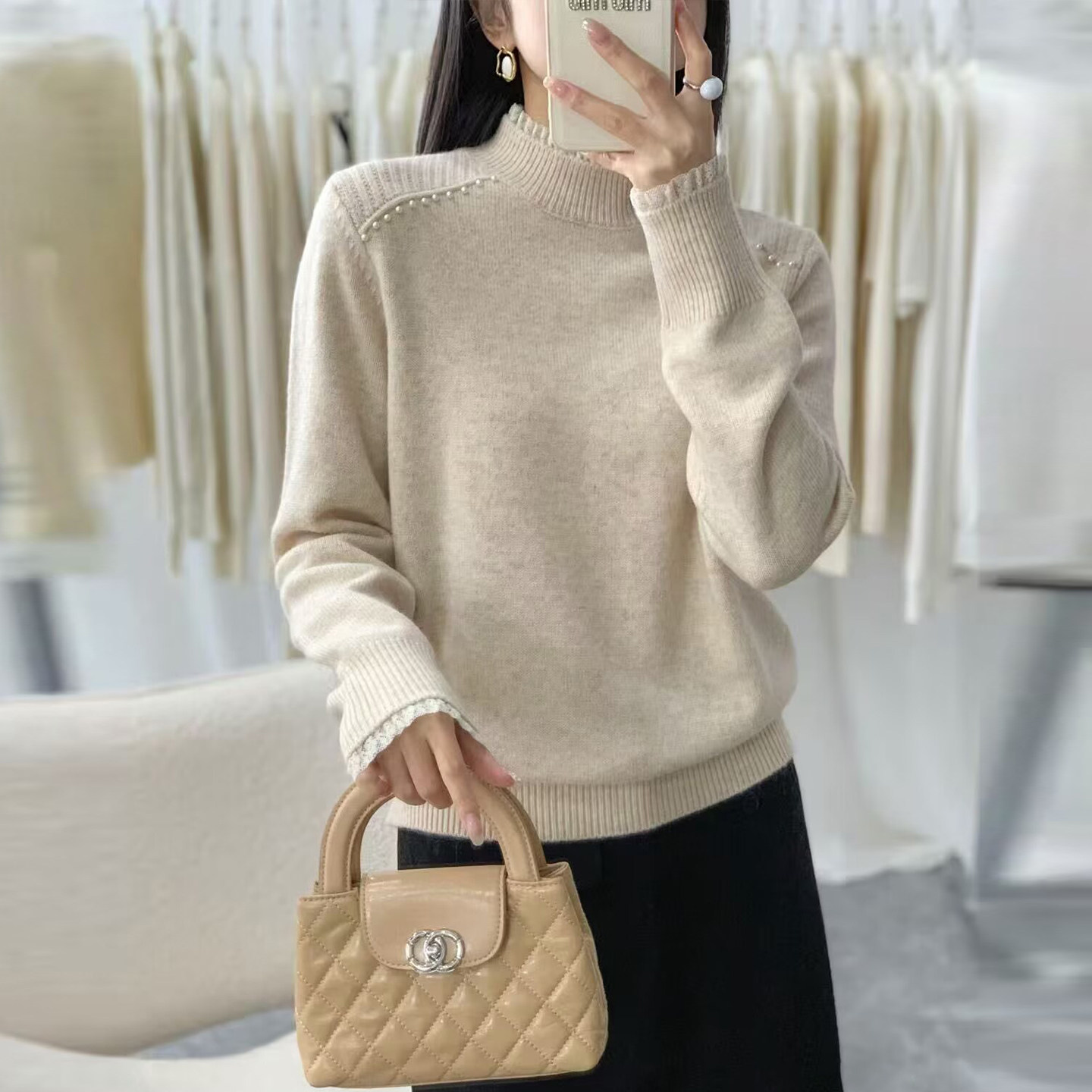 重工钉珠蕾丝拼接半高领针织打底衫女秋冬新款修身显瘦爆款毛衣女