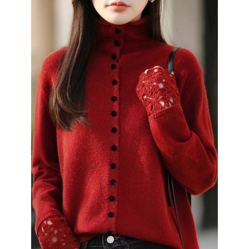 秋冬洋气高领纽扣复古针织衫女长袖百搭毛衣蕾丝拼接上衣休闲显瘦