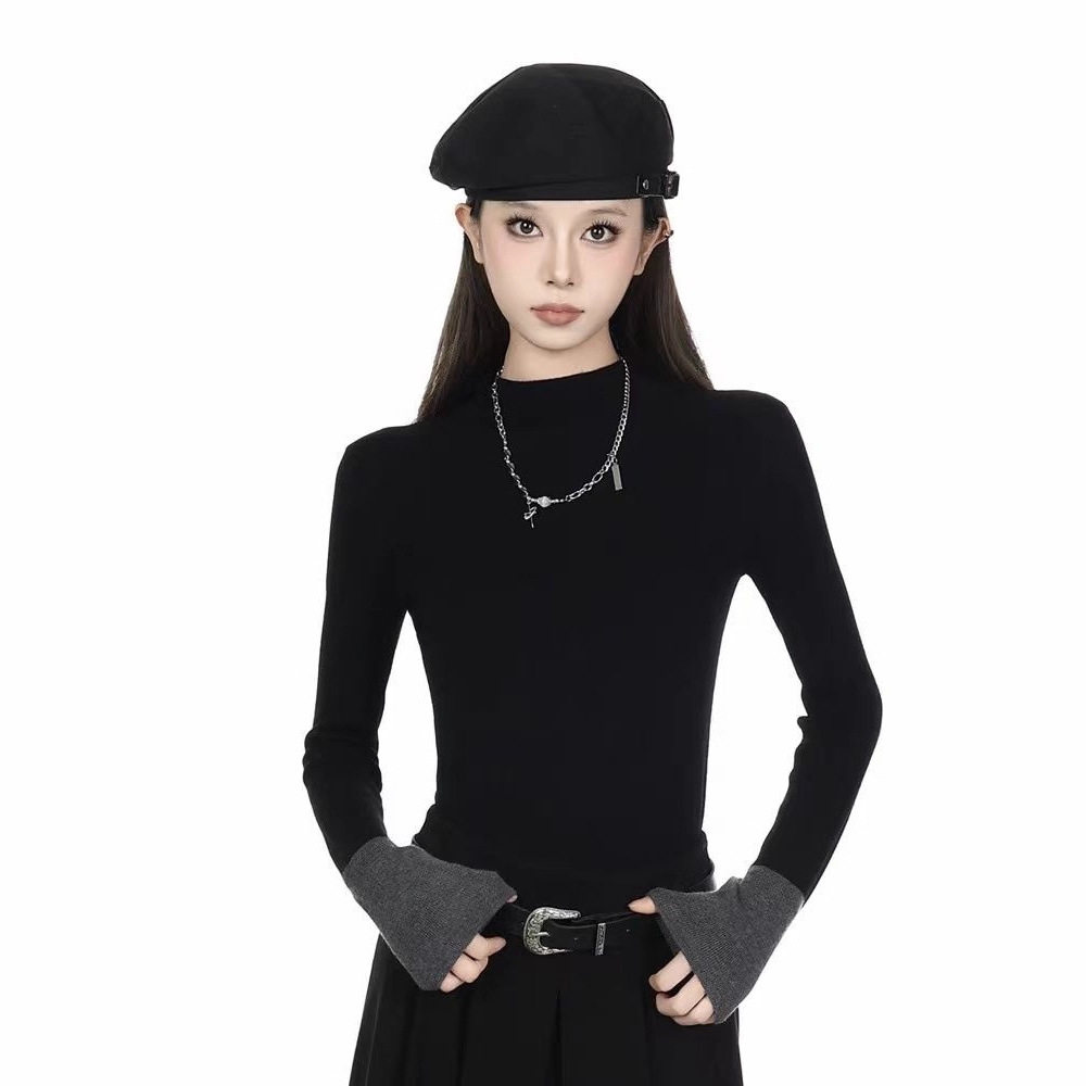 黑色半高领毛衣女拼接设计感2025秋小个子修身显瘦百搭长袖打底衫