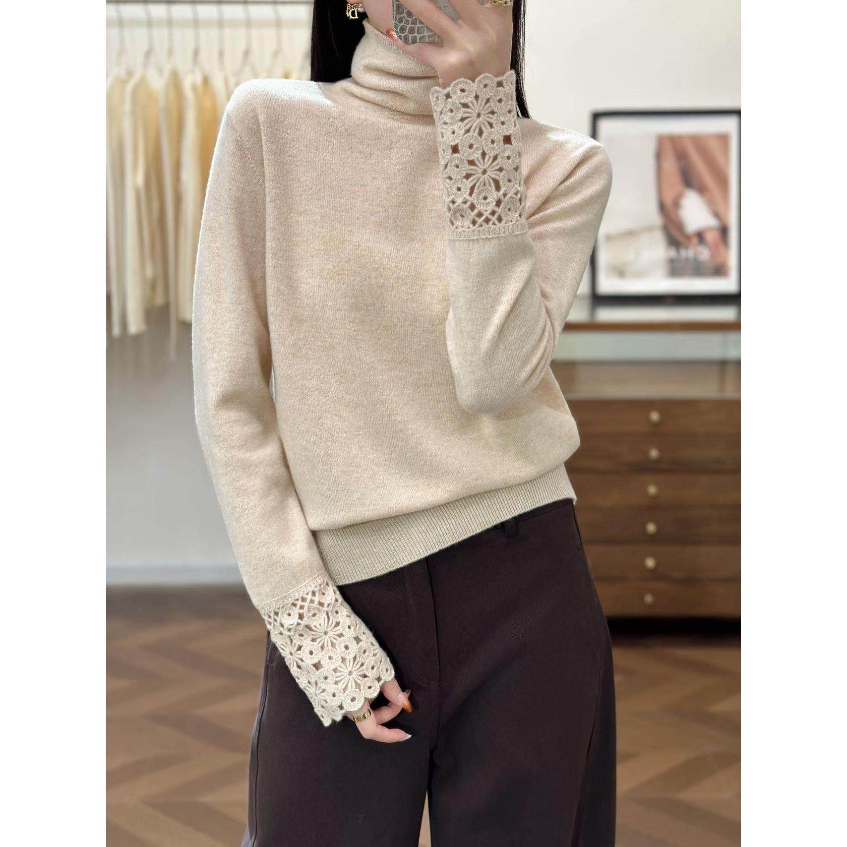 蕾丝拼接高领羊毛针织衫女欧洲站2025冬装新款欧货女装打底毛衣潮