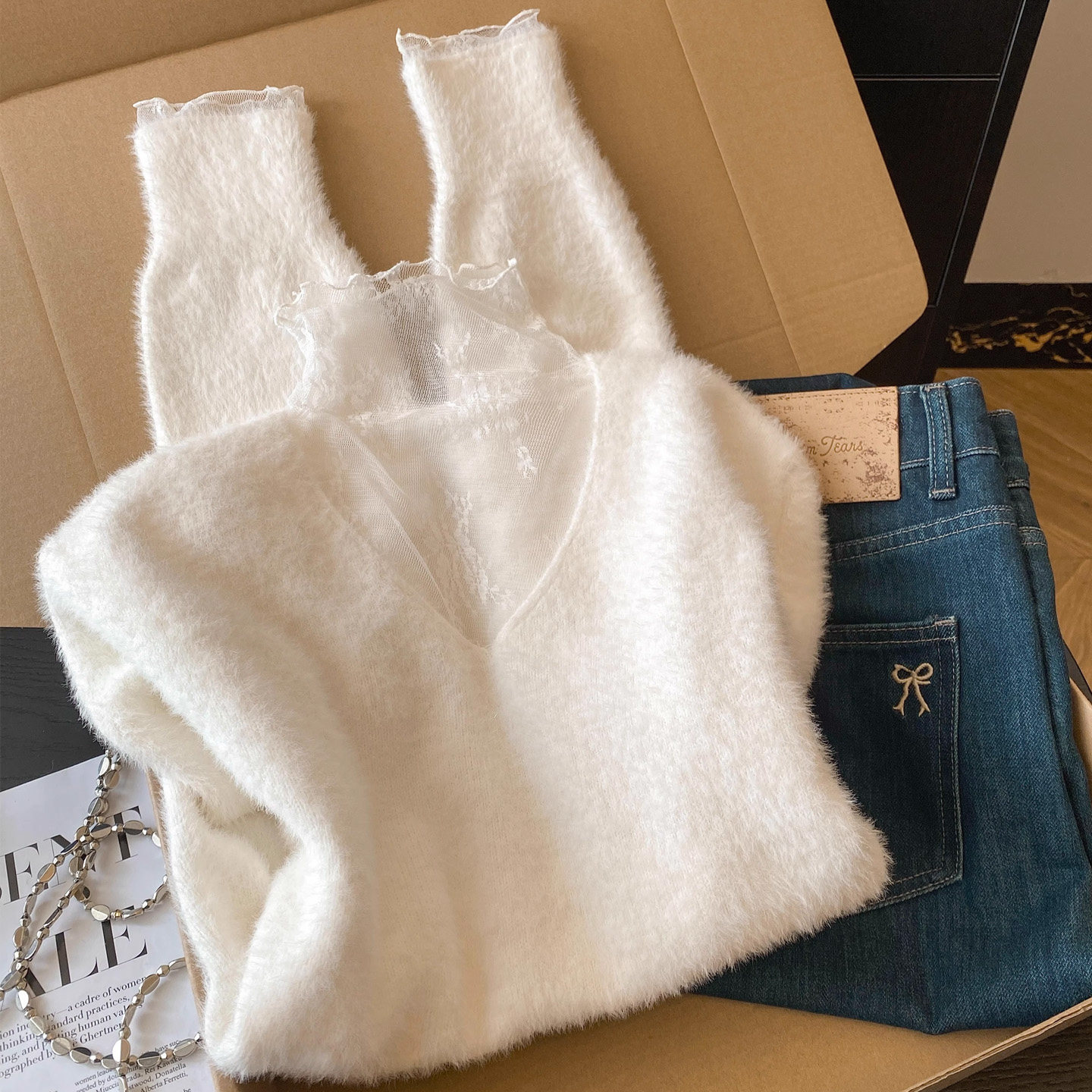 水貂绒毛衣女2025新款秋冬季加厚上衣纯欲风蕾丝拼接半高领针织衫