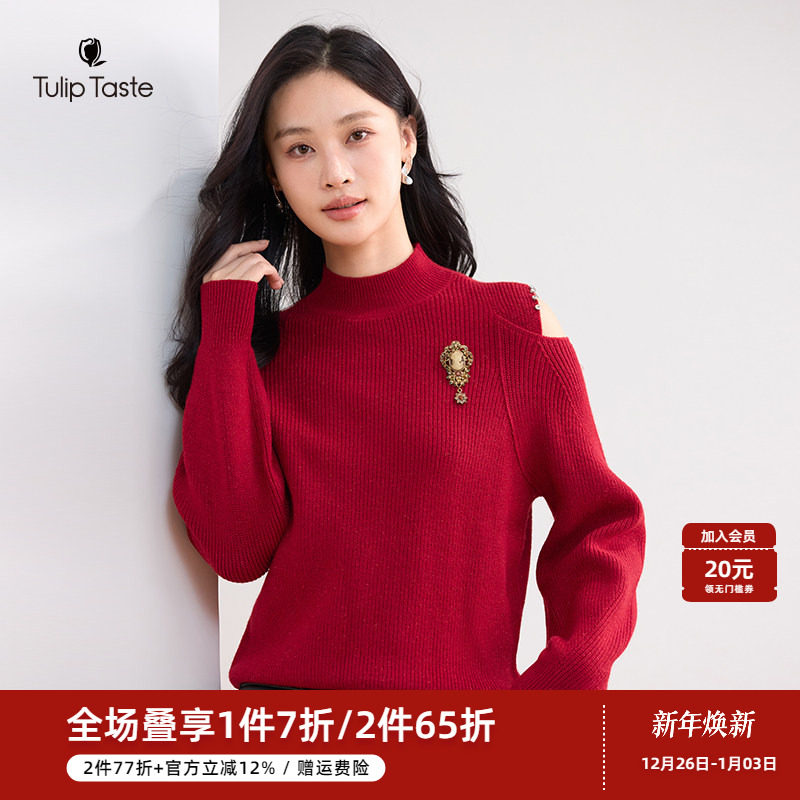 郁香菲露肩毛衣女气质优雅秋季时尚拼接长袖套头半高领针织衫上衣