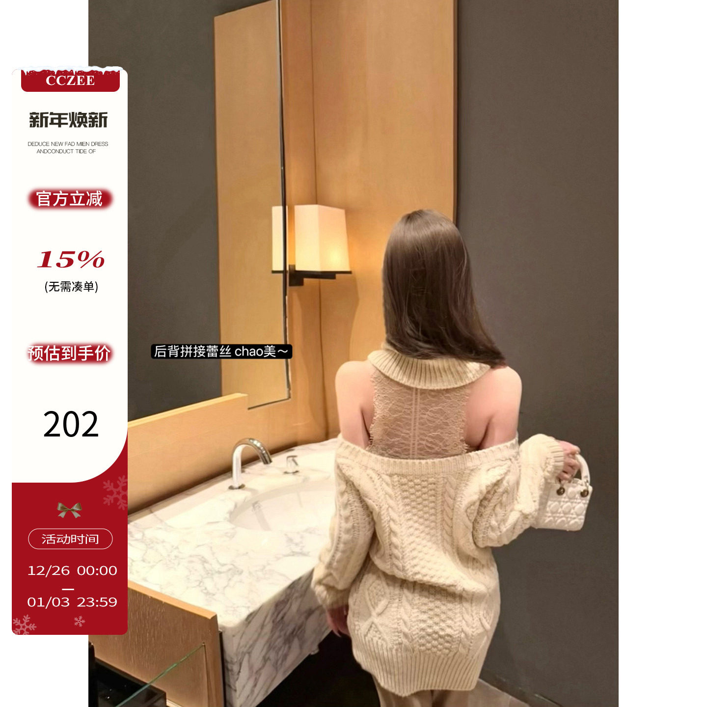 CCZEE 【缪斯美神】高领露肩绞花拼接蕾丝毛衣女冬慵懒风针织上衣