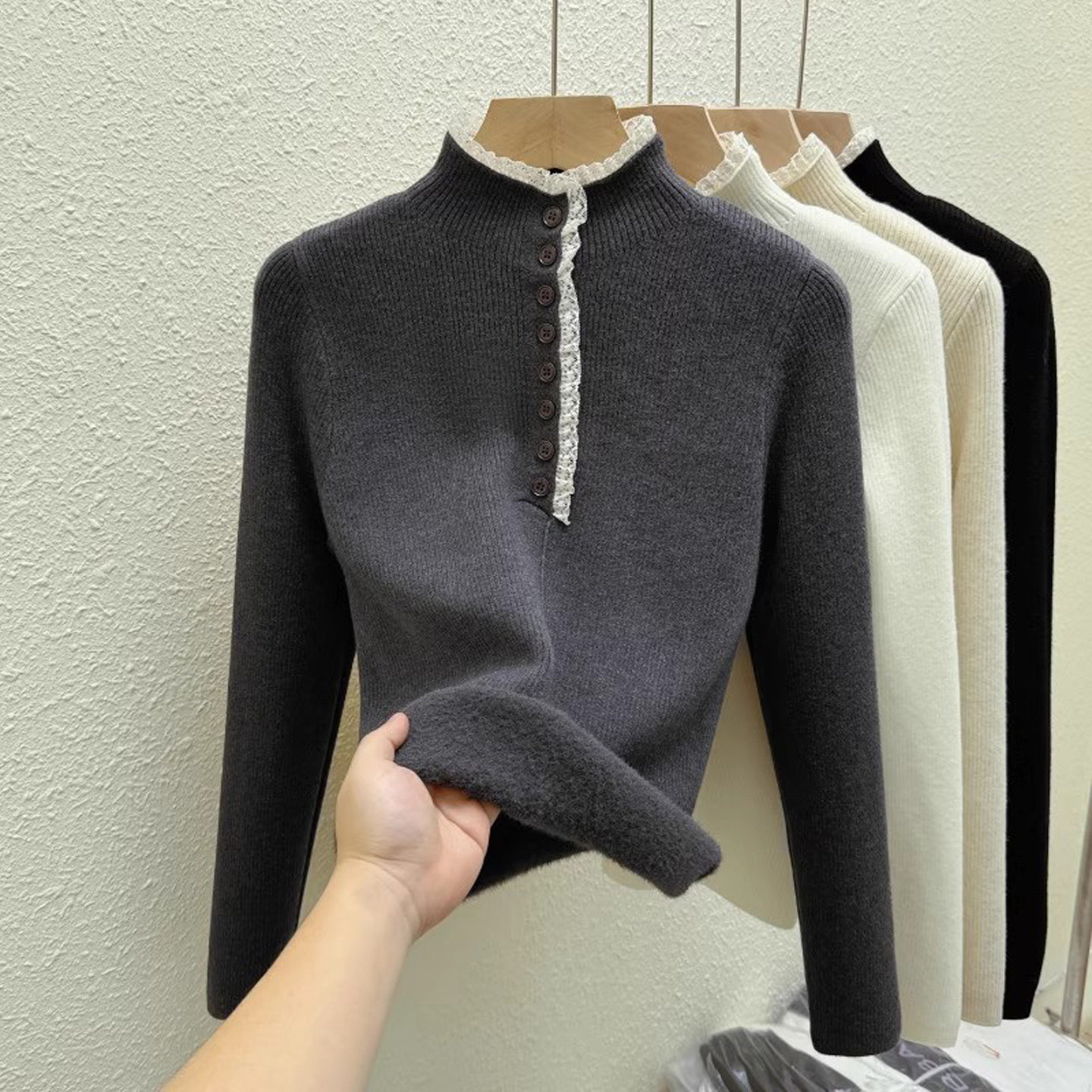 毛衣女2025新款冬季加绒加厚蕾丝拼接半高领针织衫保暖内搭羊毛衫