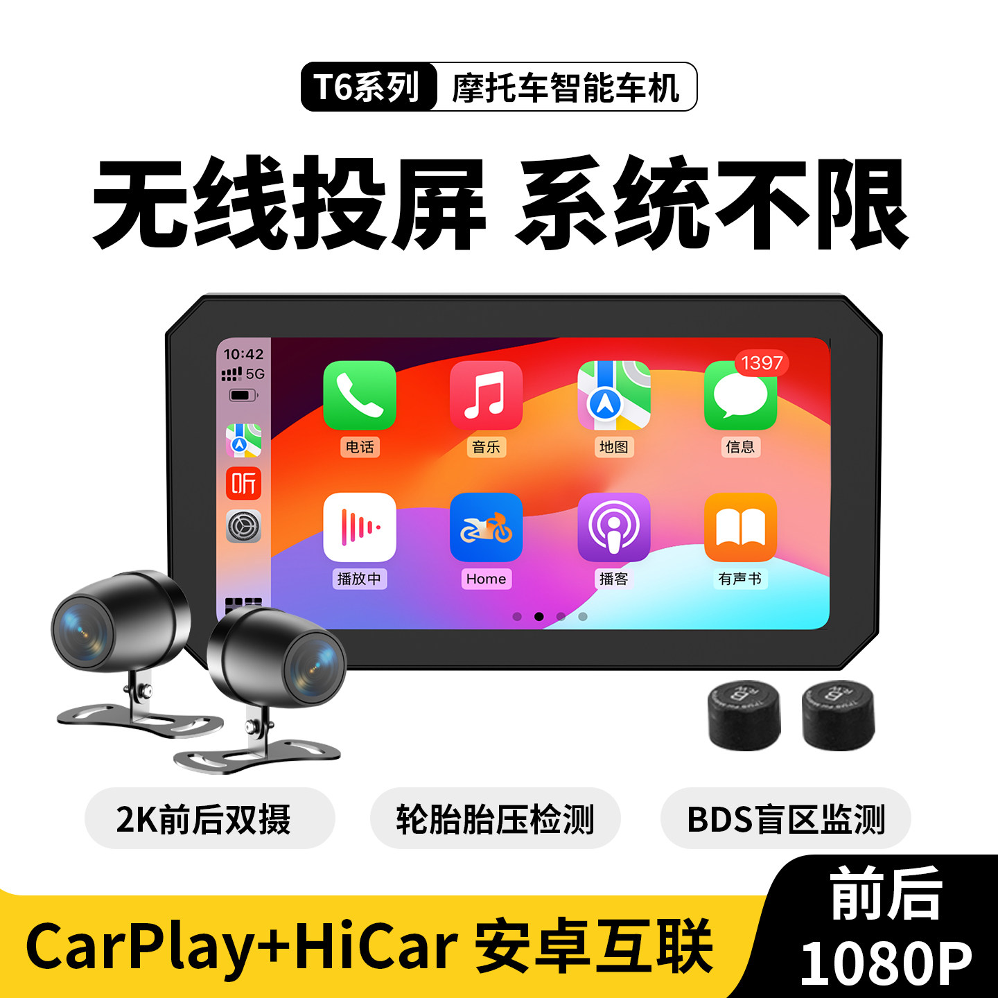新款摩托车无线carplay智能安卓auto投屏行车记录仪胎压监测车机
