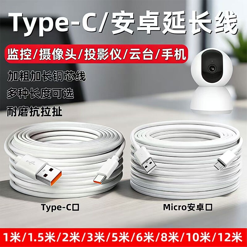 超长安卓数据线监控360摄像头usb适用小米/华为长线行车记录仪电源线手机快充micro加2/3/5/10/8米typec接口