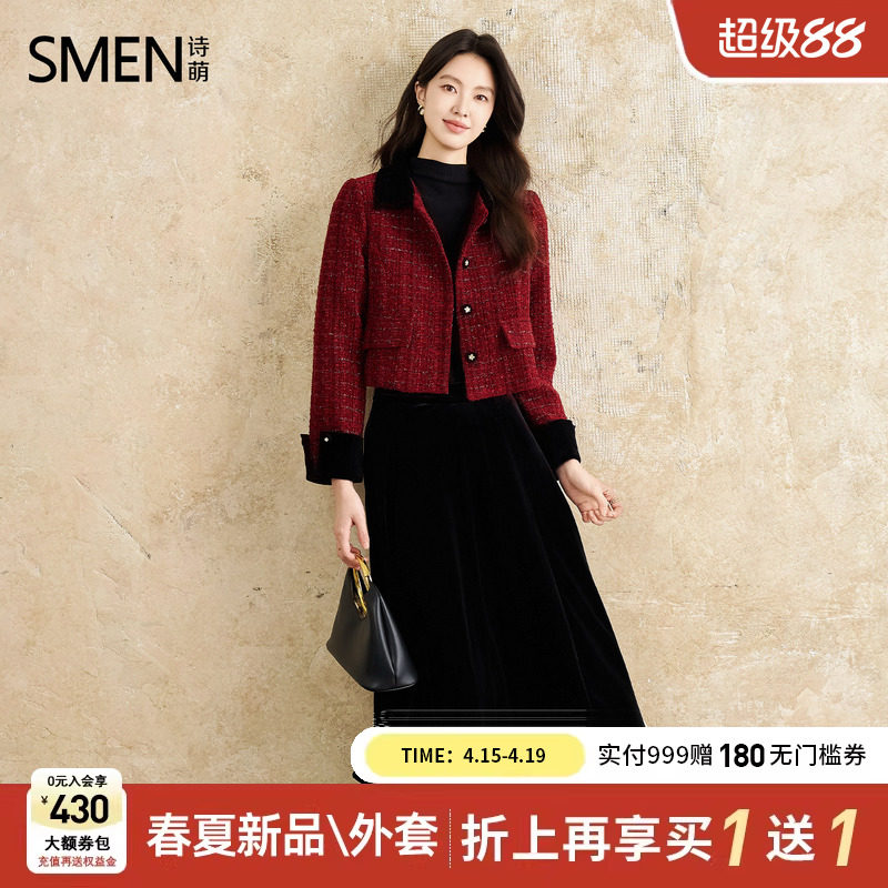 Smen诗萌2026秋冬新款时尚法式小香风粗花呢外套半裙两件套装女