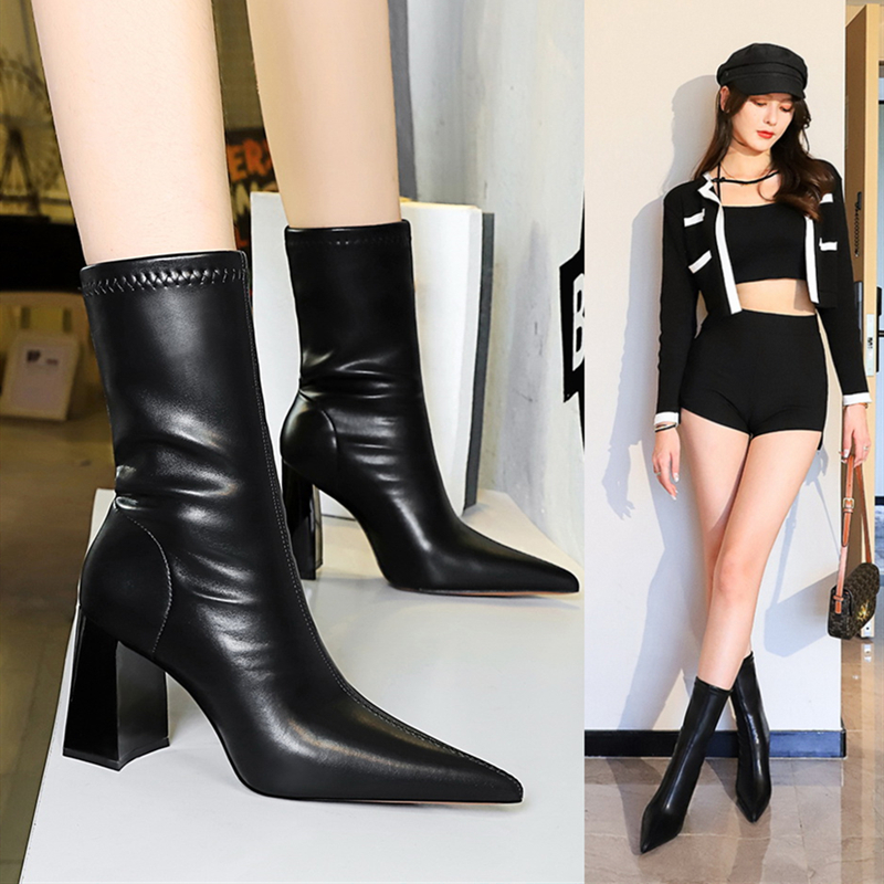 欧美风及裸靴细跟高跟尖头弹力瘦瘦靴百搭时尚女性感夜店显瘦短靴