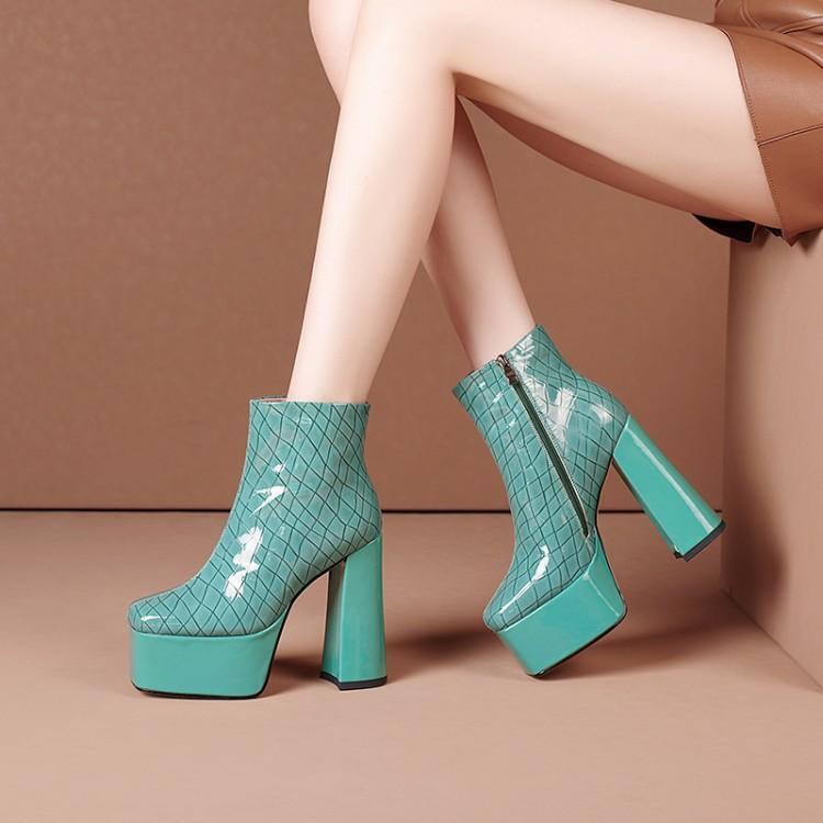 短筒女性感防水台粗跟高跟短靴厚底鞋亮皮灰色蓝绿色真皮女靴 LYG