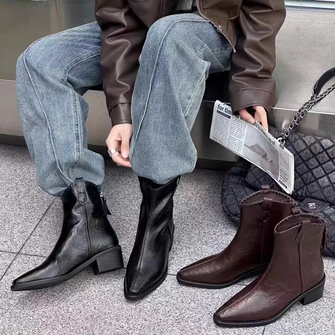一代佳人 2025早秋新款女性 短靴 方跟 尖头 套筒 后拉链