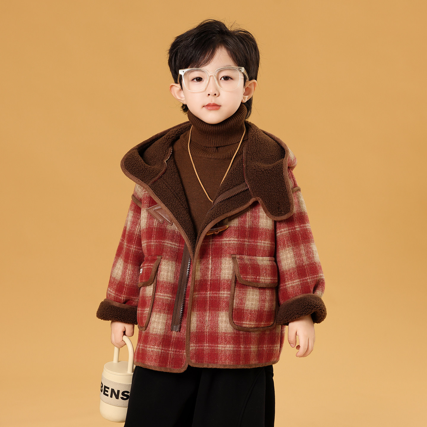 男童加绒毛呢外套秋冬装2025新款儿童加厚冬季男孩连帽格子呢大衣