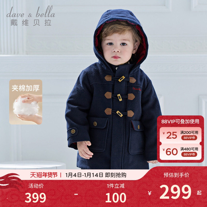 戴维贝拉儿童棉服2026冬装新款男童呢大衣中大童学院风中长款外套