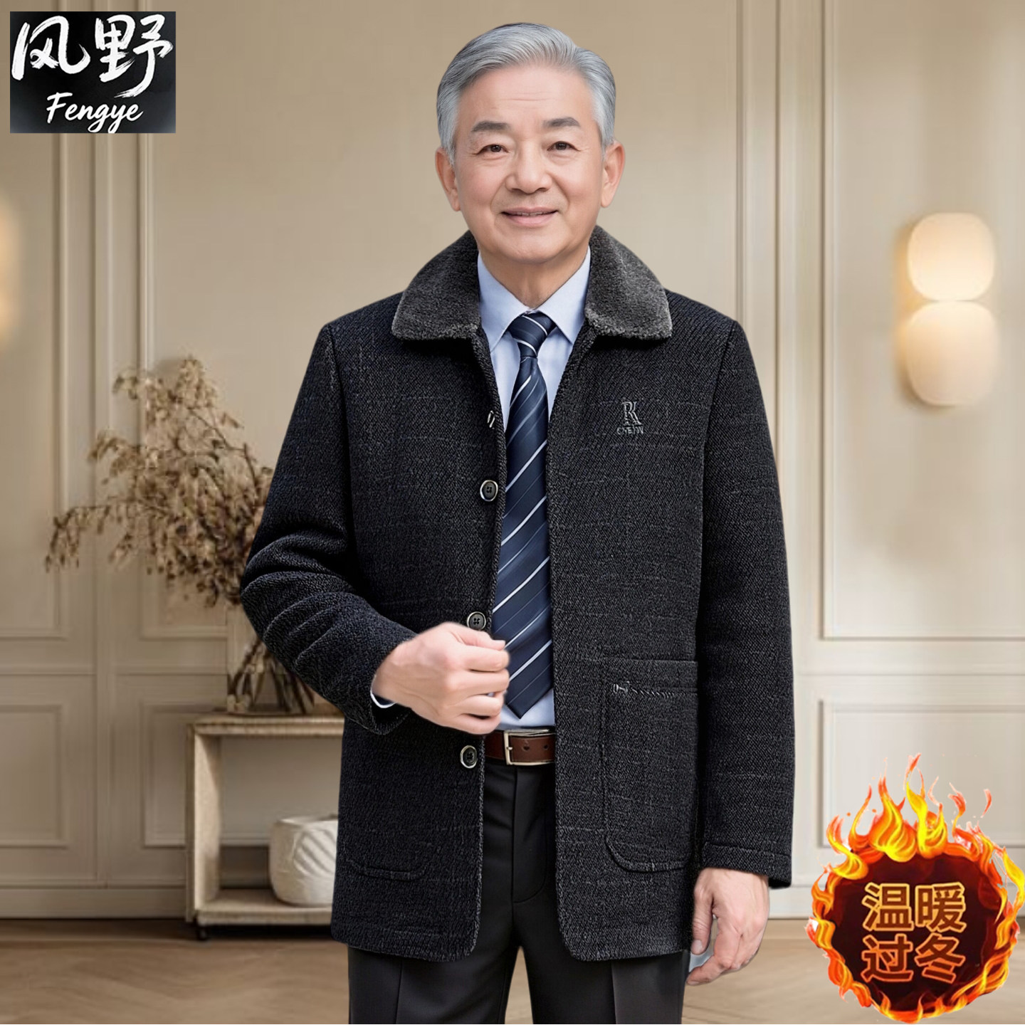 冬季新款中年男士毛呢大衣加绒加厚保暖爸爸冬装外套爷爷呢子上衣