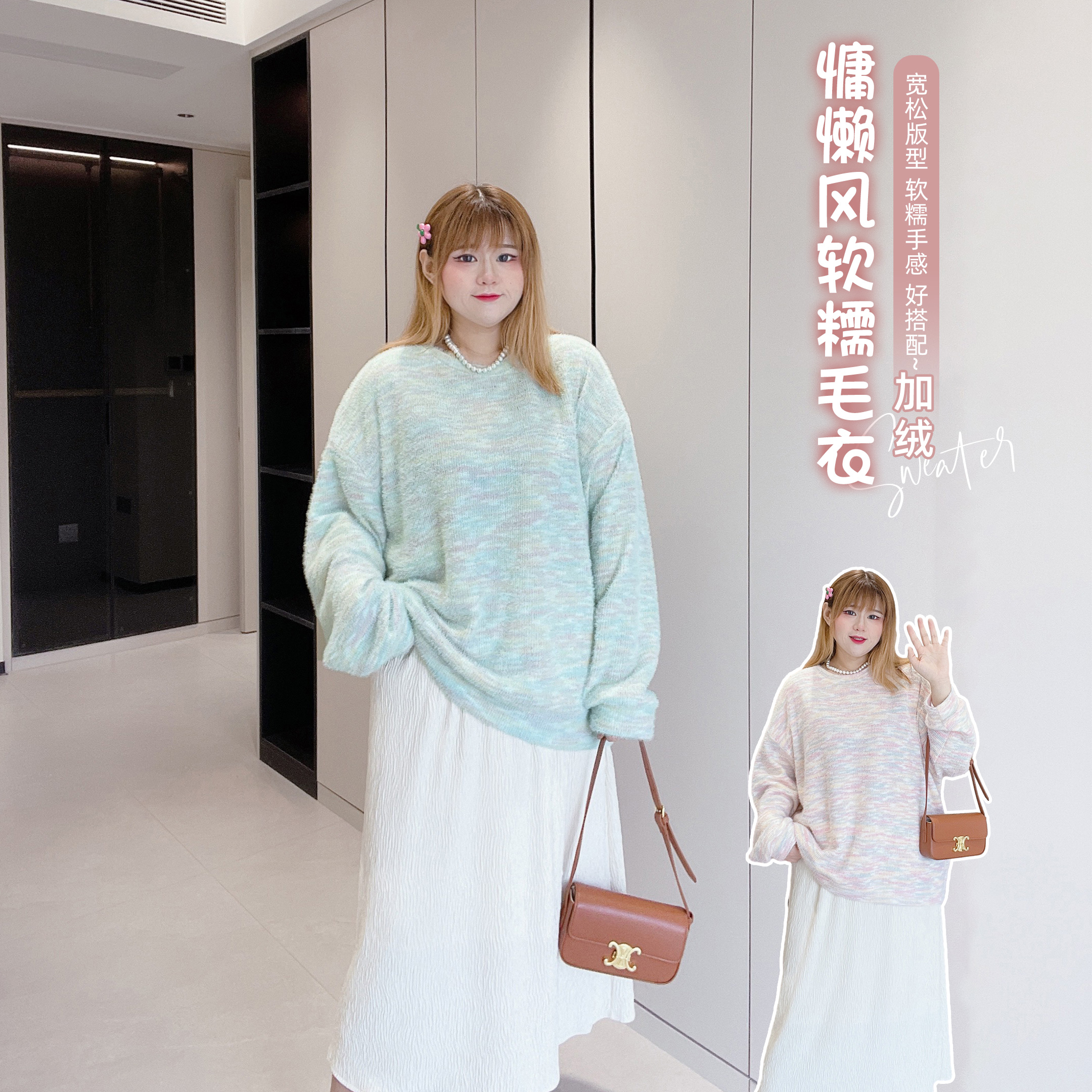 胖莹莹大码女装秋冬胖妹mm韩版慵懒风软糯宽松针织上衣彩虹条毛衣