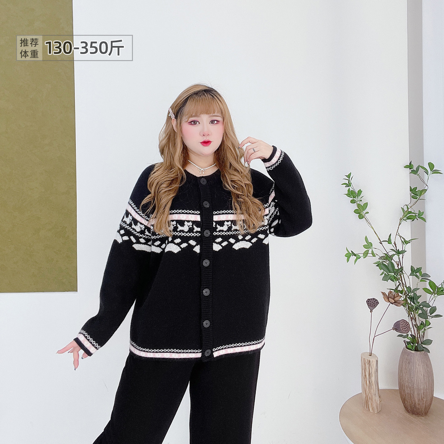 胖莹莹大码女装300斤加肥设计感气质撞色减龄宽松显瘦针织开衫