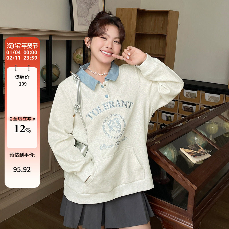 秋天巨好看的上衣大码女装新款胖mm设计感撞色polo领正肩显瘦卫衣