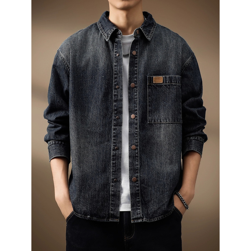 高级复古牛仔衬衫男士长袖秋季新款宽松大码翻领纯棉休闲衬衣外套