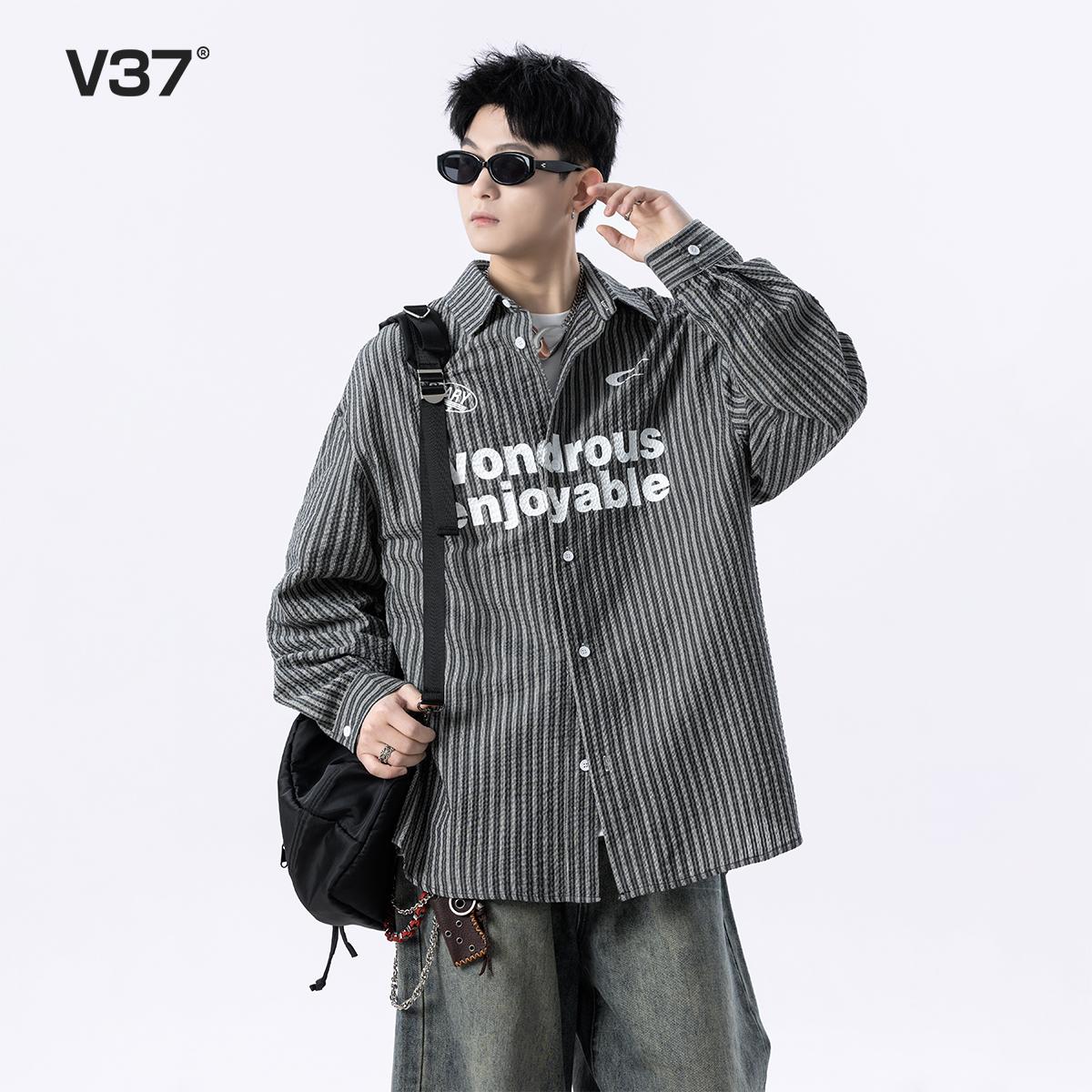 V37字母印花长袖衬衫男士2025秋季新款美式竖条纹青少年衬衣外套