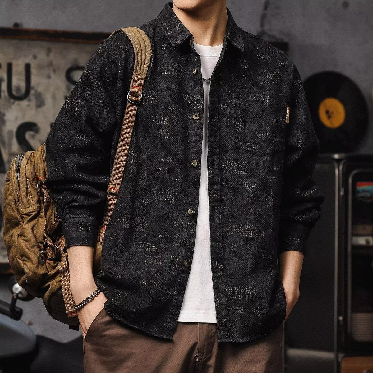 牛仔衬衫男士2025春秋新款提花复古水洗翻领休闲长袖大码衬衣外套