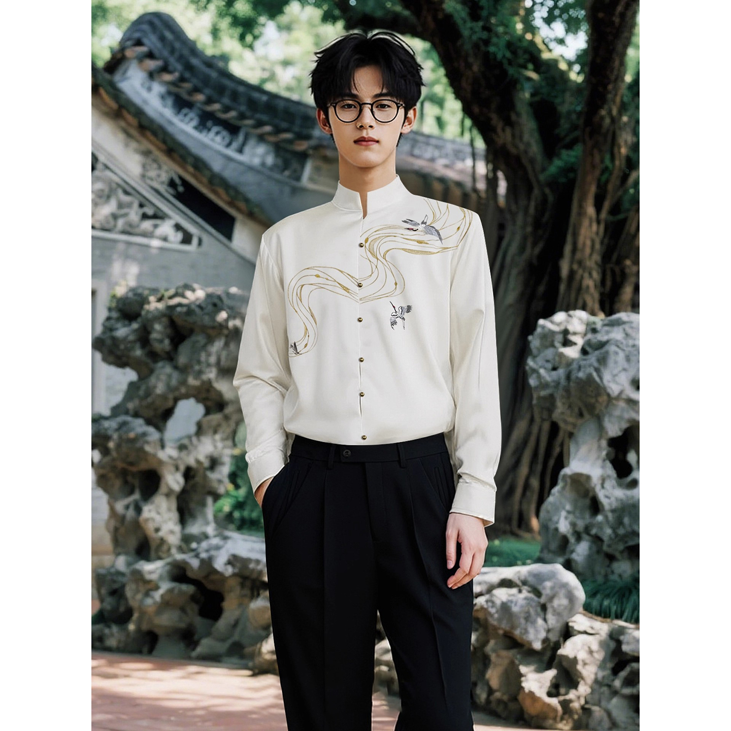 新中式仙鹤刺绣立领长袖衬衫男士套装高级感新郎结婚订婚穿搭衬衣