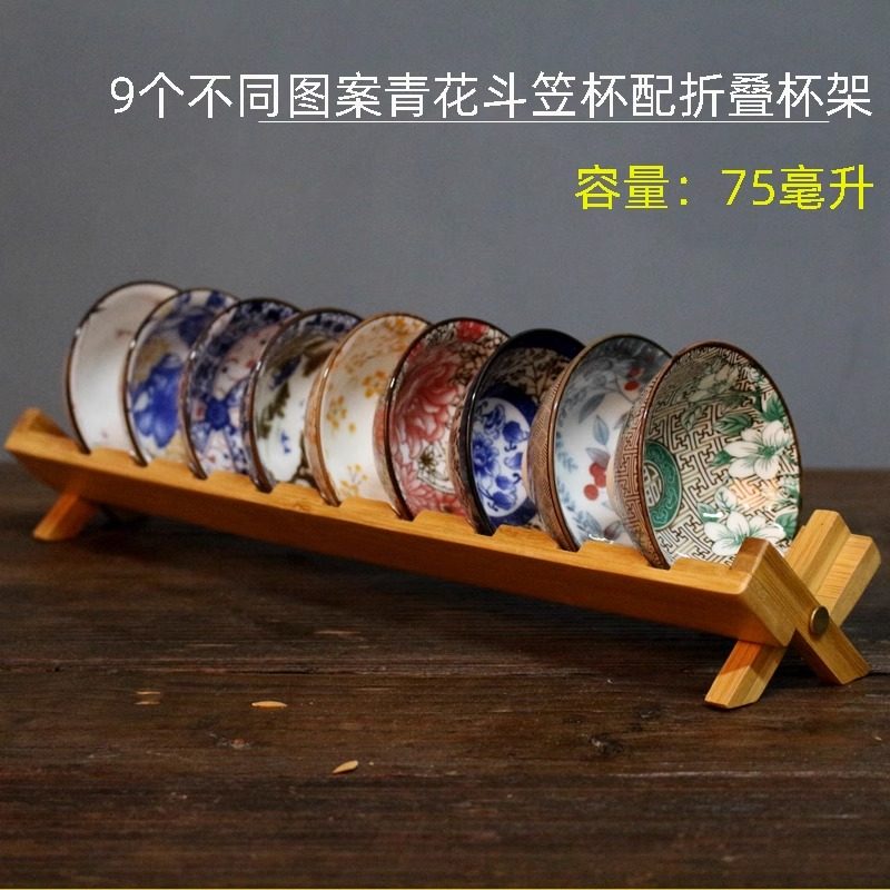 青花瓷斗笠杯9个陶瓷茶杯家用高档建盏主人杯品茗杯送沥水竹杯架