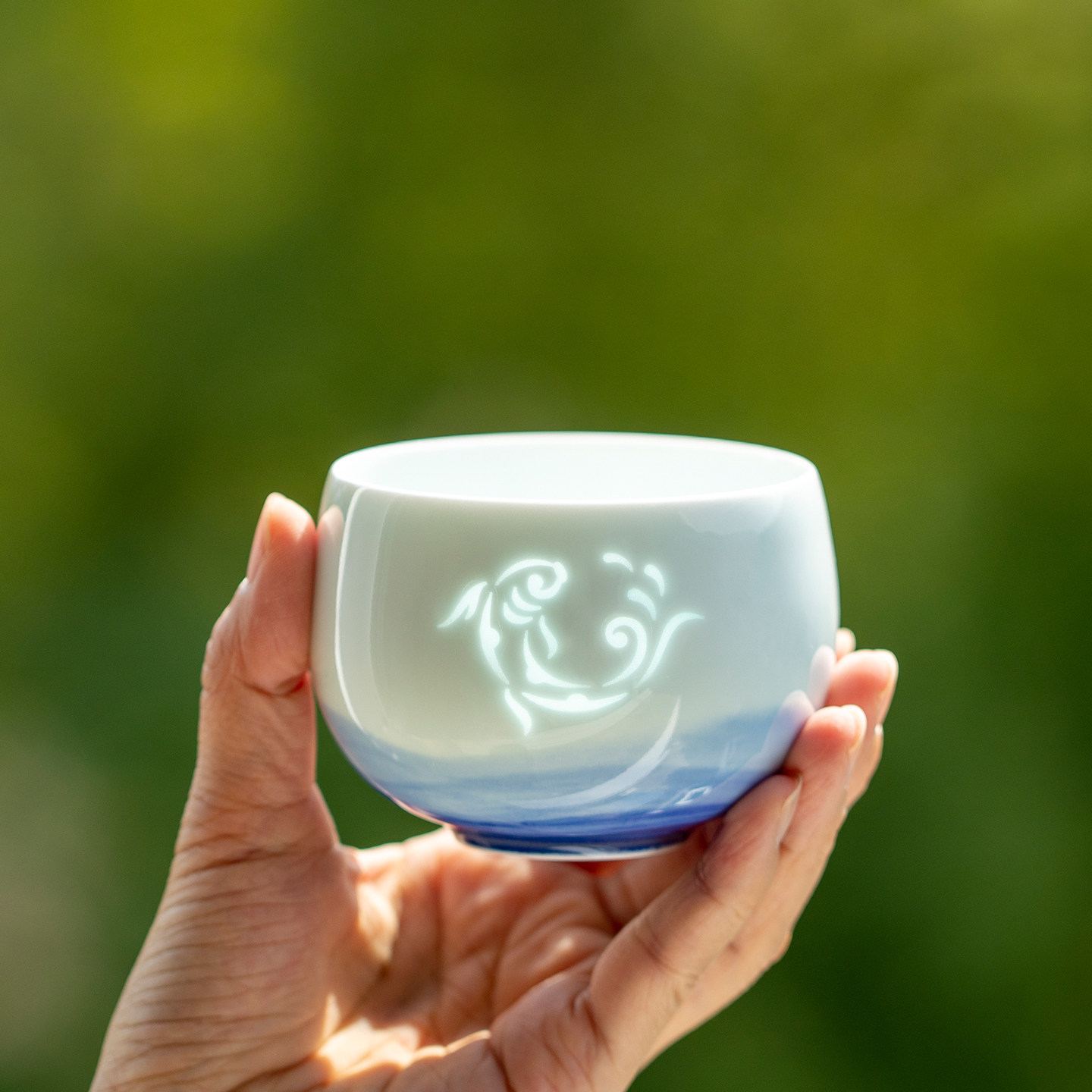 山水间鱼跃青花手绘玲珑茶杯主人杯景德镇手工陶瓷中式茶器礼品杯