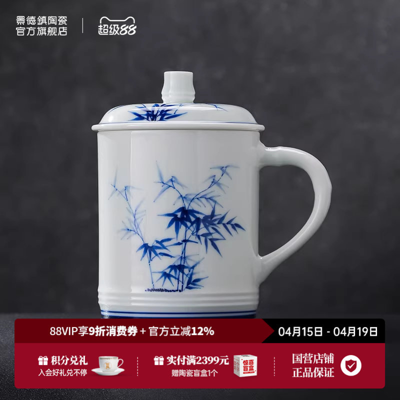 景德镇官方陶瓷釉下手绘青花大容量中式带盖办公杯喝茶杯自用送礼