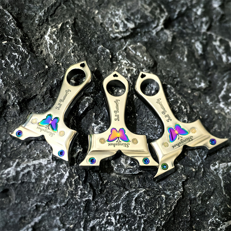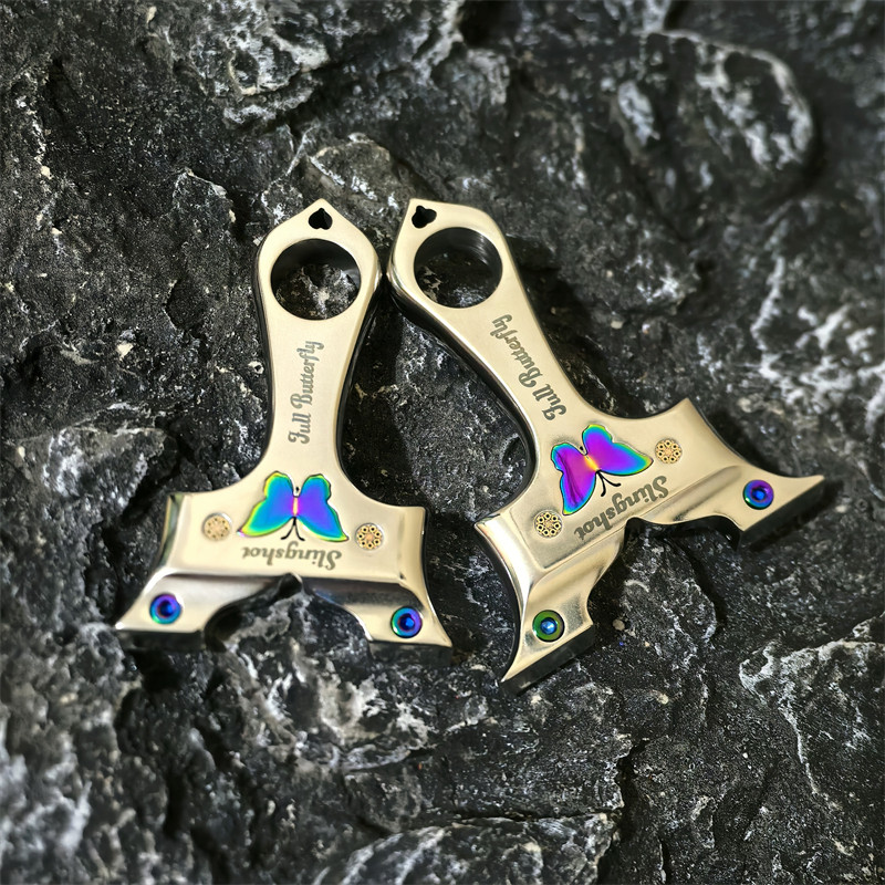 新款不锈钢炫彩蝴蝶弹弓五代龙齿快压越南外贸扁皮户外可移动拆卸