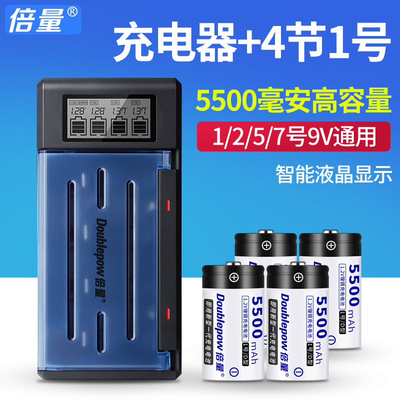 倍量1号智能充电器套装配4节10000毫安大容量一号大号D型充电电池