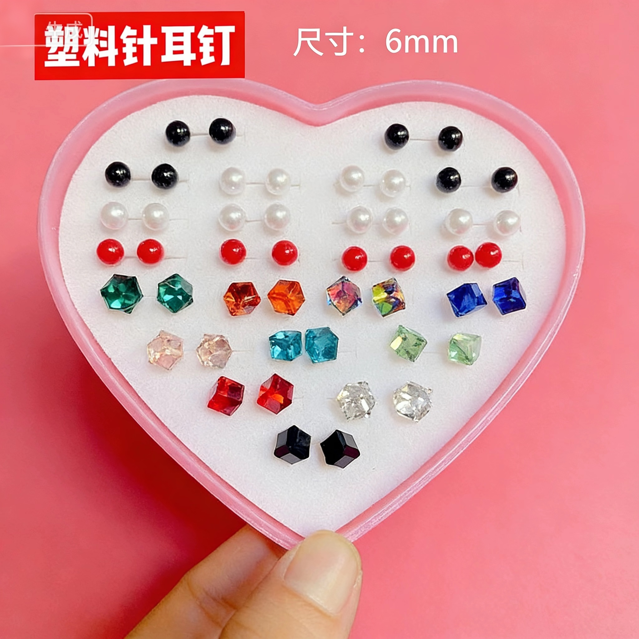 2025新款爱心盒装胶针塑料耳钉仿珍珠水立方混装套装圆形小耳钉