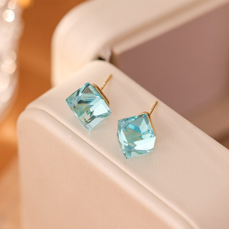 韩版立方体精致清透水立方耳钉潮时尚甜美少女感气质变色水晶耳环