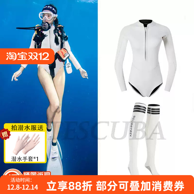 取雾 2MM潜水服女连体水母服白色长筒袜保暖防晒专业自由浮潜湿衣