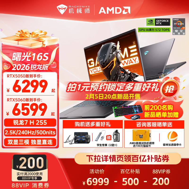 【24分期免息】机械师MACHENIKE 曙光16S 锐龙R7/R9酷睿i7/i9 RTX5060/5070独显2.5K高刷游戏本笔记本电脑187