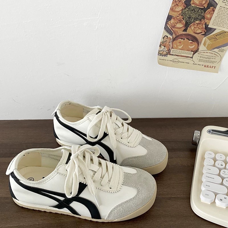 时尚拼色系带运动女鞋2025年秋季新款真皮学生百搭休闲平底德训鞋