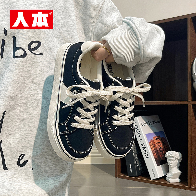 人本官方店百搭帆布鞋休闲运动板鞋拼色鞋平底鞋学生系带复古女鞋