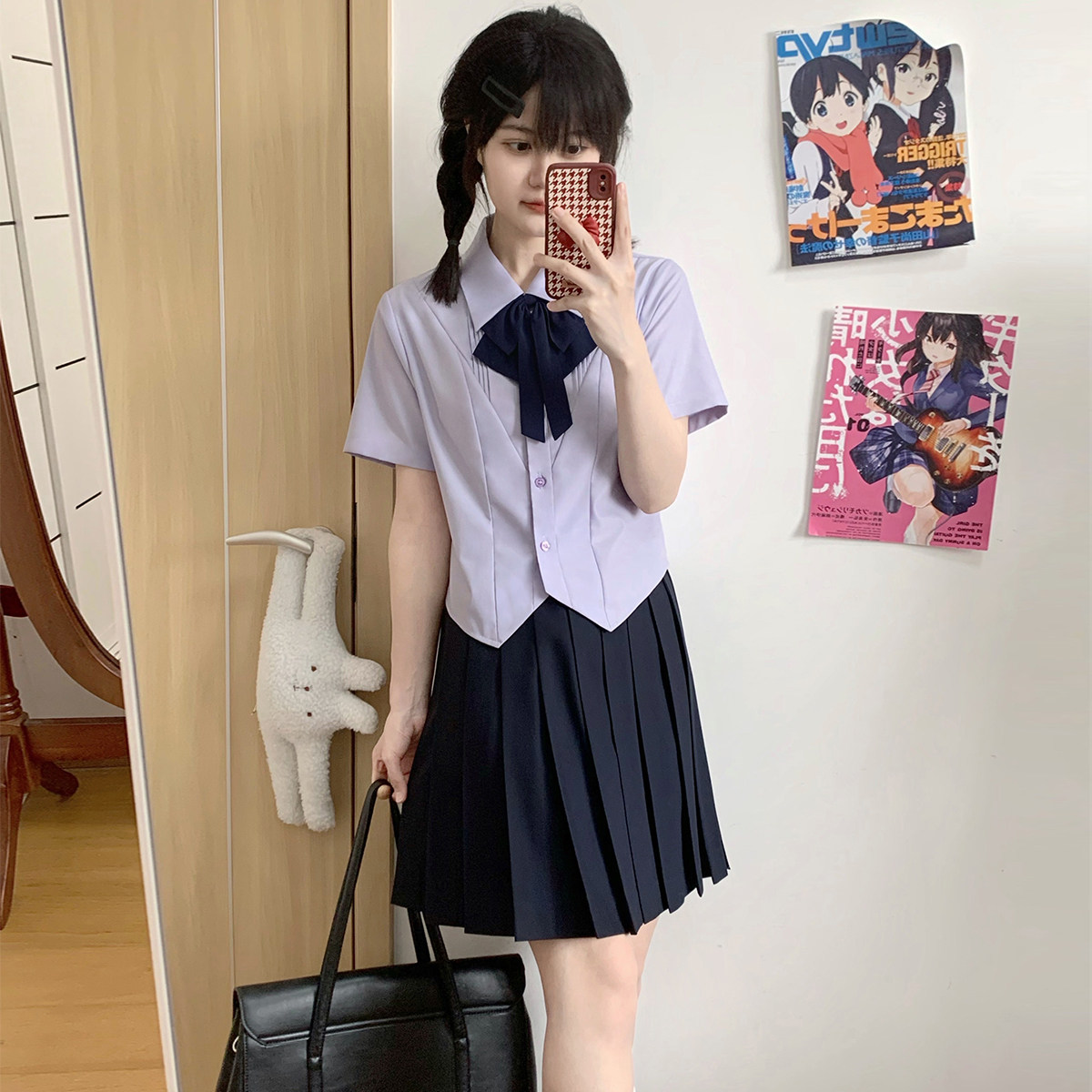学院风短袖衬衫套装大码中长款半身长裙百褶裙jk制服班服学生女夏