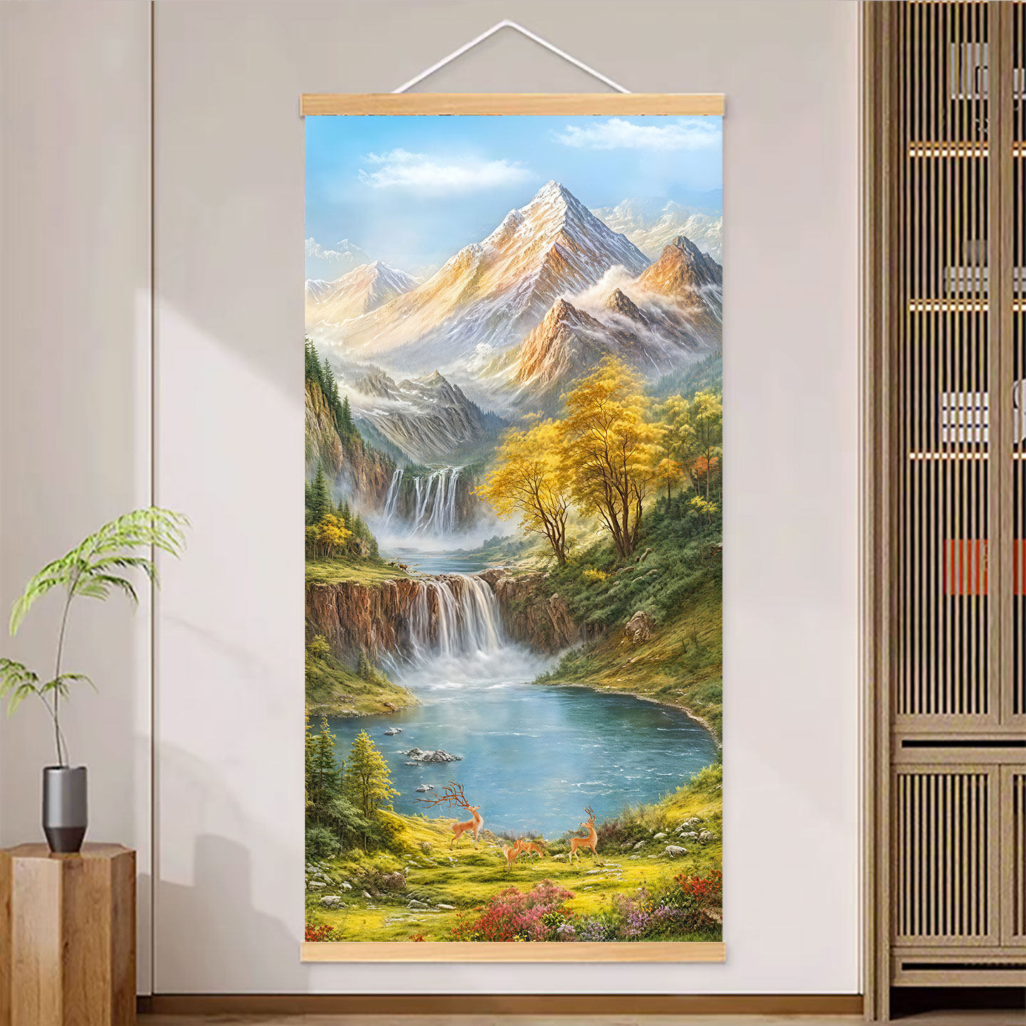聚宝盆山水画玄关装饰画竖版过道风水靠山美式挂画招财画欧式壁画