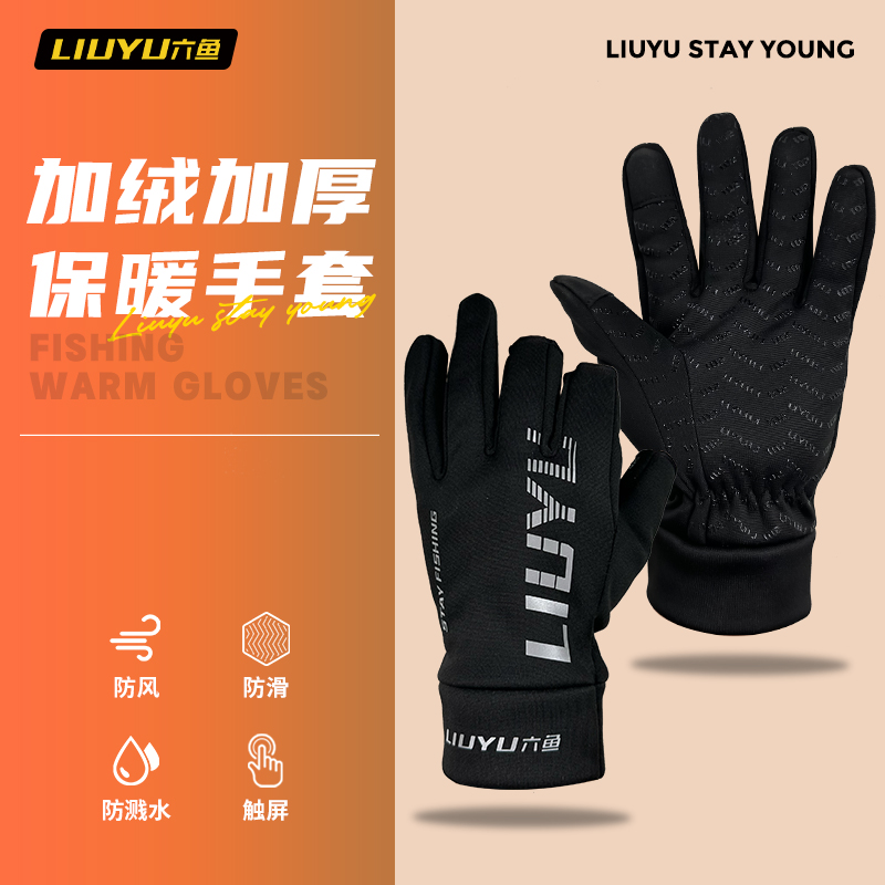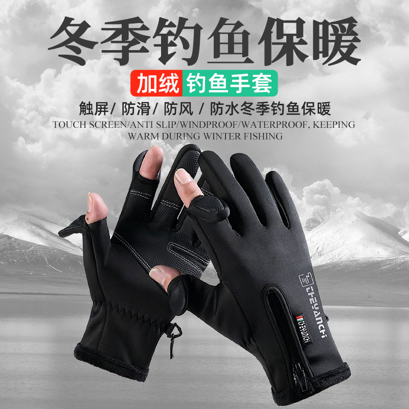 钓鱼手套漏二指触屏冬季天户外加绒保暖男士外卖骑行加厚防水手套
