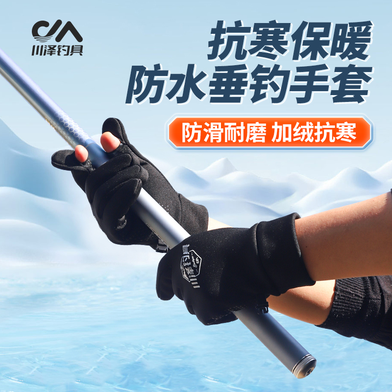 川泽冬季加绒钓鱼手套防水防刺保暖二指翻盖冰钓路亚专用户外手套