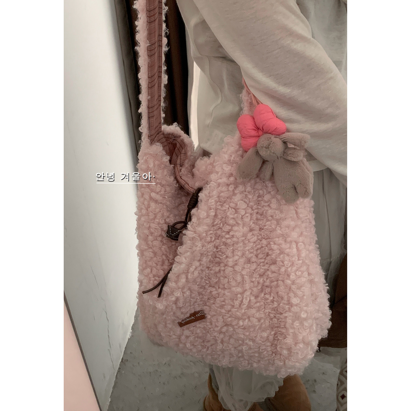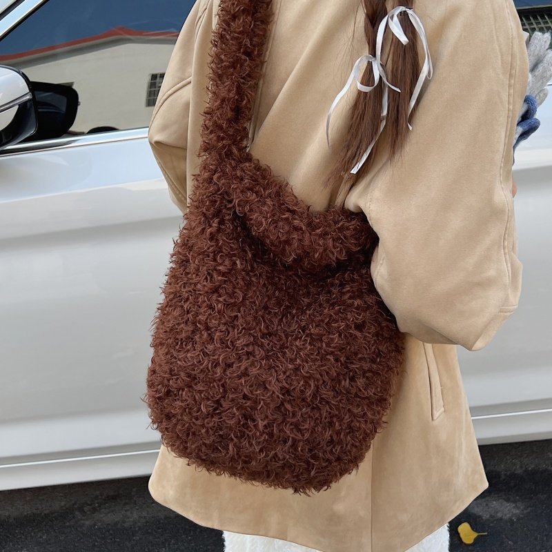 冬季羊羔毛毛包包女大容量斜挎毛绒水桶包小众百搭学生通勤单肩包