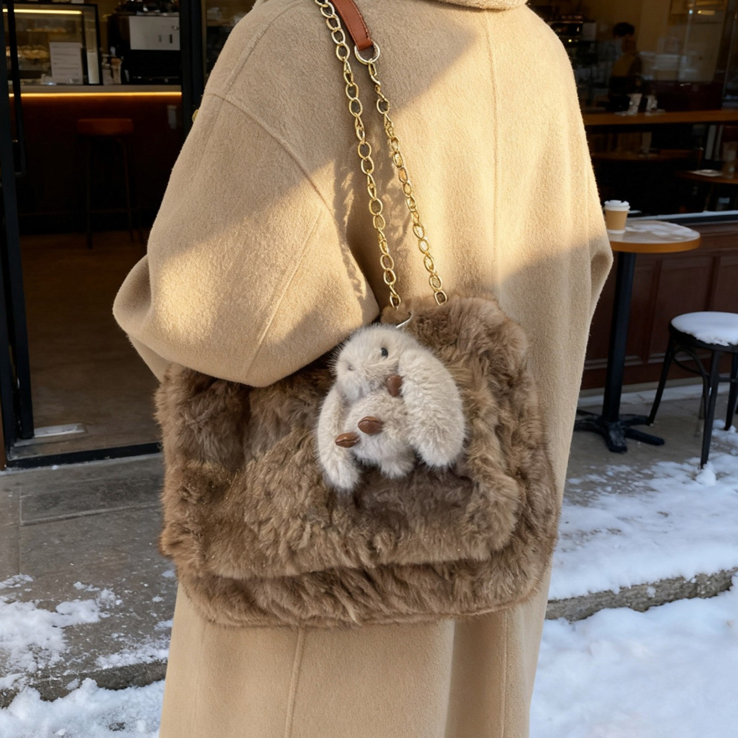 毛绒包包女2025新款秋冬百搭小众兔子手提链条斜挎包毛毛包小圆包