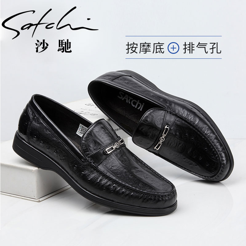 沙驰品牌男鞋软底透气中年鸵鸟纹真皮春秋商务休闲皮鞋男士豆豆鞋