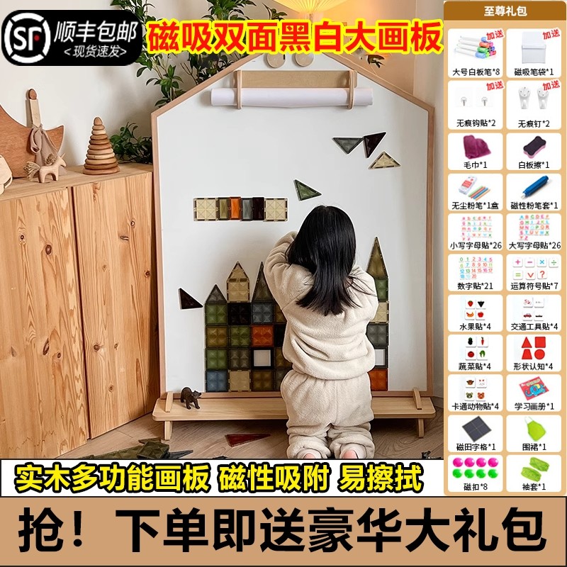 儿童画板磁性涂鸦小黑板积木墙2合1双面宝宝绘画写字板支架式家用