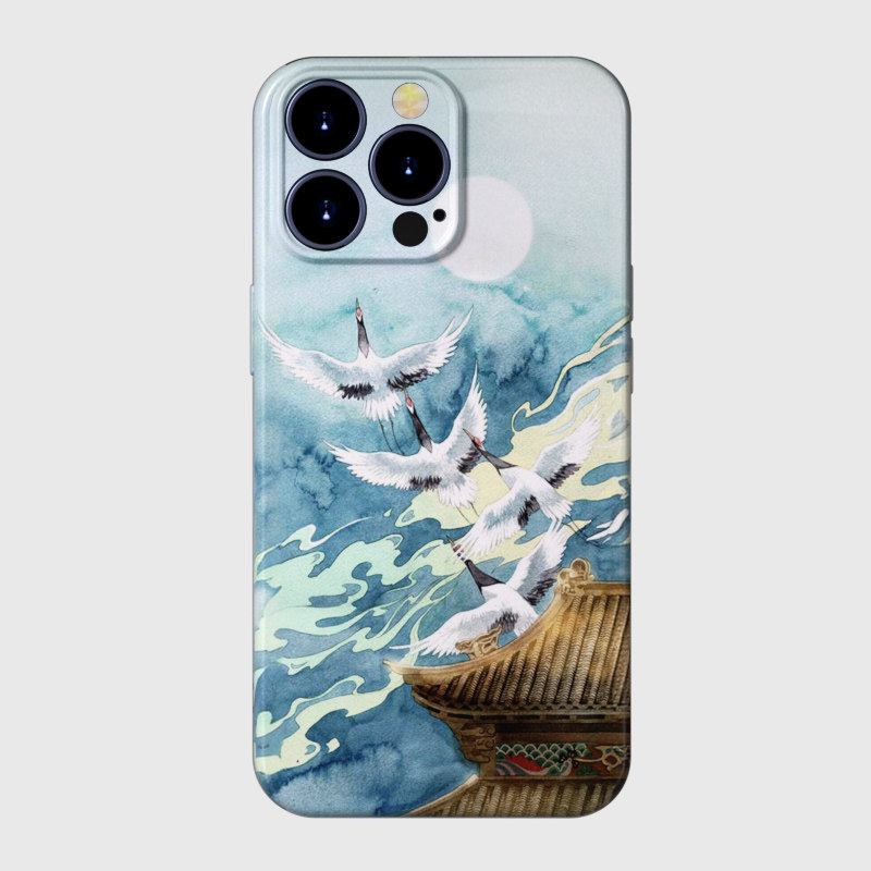 群鹤逐日iphone苹果15 14 13 12 11 15pro promax手机壳mini复古建筑中国风插画女士全包软壳x xr适用7 8plus