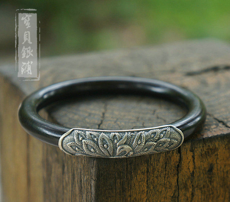 925纯银民族风 七夕 凤穿牡丹 手工黑檀木 时尚送女友 银木手镯